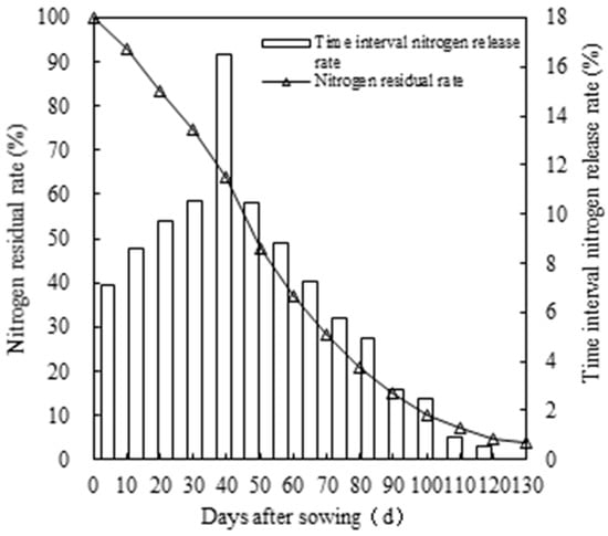 The release profile of the CRNF was determined in 2020 using the buried-bag method [60]. Briefly, 10 g samples of CRNF were bagged and buried in the soil (5 cm deep and 20 cm apart) after rice sowing. In order to avoid the effect of CRNF samples on rice growth in the plot, the samples were buried in adjacent unfertilized plots. Three bags were collected every 10 days after burial. After rinsing the impurities on the surface of the mesh bag with flowing pure water, the nitrogen residual rate in the CRNF sample was determined using the Kjeldahl method [61]. The time interval nitrogen-release rate was expressed as the difference between the nitrogen residue rates at two adjacent measurement times.
