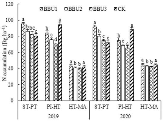 Different fertilization treatments exerted significant effects on N accumulation (Figure 2). At each growth stage, the BBU1 treatment resulted in the accumulation of significantly more N than either the BBU2 or BBU3 treatments. Additionally, from sowing time to panicle initiation stages, BBU1 accumulated 18.5–27.1% more nitrogen than CK; from panicle initiation to maturity stages, BBU1 and CK had no significant difference.
