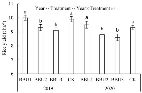 Grain yield of direct-seeded rice tended to decrease with increasing CRNF application in the one-time fertilization treatments (Figure 3). The highest yields were achieved using BBU1 in both 2019 (10 t ha−1) and 2020 (9.5 t ha−1). Rice yields were 7.5–8.0% and 9.9–10.5% higher in BBU1 than in BBU2 and BBU3, respectively (p < 0.05). Rice yield was also higher in BBU1 than in CK, although the difference was not significant.