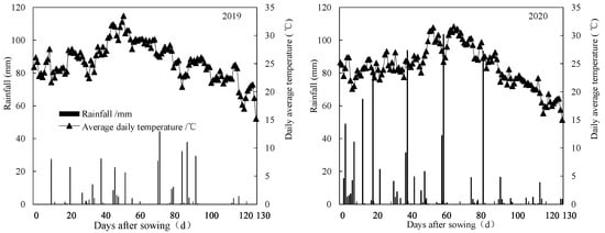 Rainfall and daily average temperatures during the rice-growing period in 2019 and 2020.