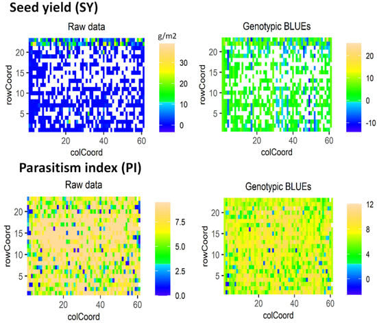 Spatial analysis using row and column coordinates for seed yield (SY) and parasitism index (PI) showing the raw data, best linear unbiased estimates (BLUEs) and genotypes distribution frequency.