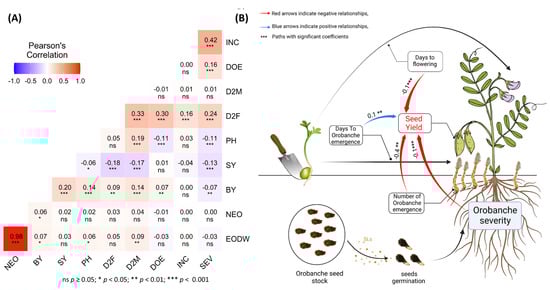 (A) Correlation analysis among morphological parameters of lentil in response to O. crenata infection under field conditions during the cropping season 2018–2019. (B) The path analysis numbers adjacent to the arrows indicate the relationship effect size and the stars are associated with the bootstrap p-value. Blue and red arrows indicate positive and negative relationships, respectively; only significant paths are presented. D2F: Days to flowering; DOE: Days to Orobanche emergence; EON: Emerged Orobanche number; EODW: Emerged Orobanche dry weight; BY: Biological yield; SY: Seed yield. *** Correlation is significant at the 0.001 level; ** Correlation is significant at the 0.01 level; * Correlation is significant at the 0.05 level.