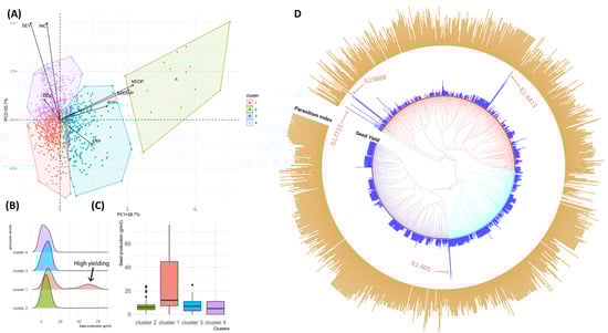 (A) Biplot of the first two dimensions of the principal component analysis (PCA) for the 1315 genotypes based on their agronomic and pheno-physiological performance under O. crenata infection under open field conditions. (B) Density plot showing the distribution of genotypes for each cluster based on seed yield (SY) (C) Box plots showing the SY comparison between the different clusters (D) Cladogram showing relationships between PI and SY recorded for the total of 1315 lentil germplasms.
