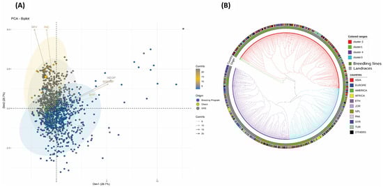 (A): Biplot of the first two dimensions of the principal component analysis (PCA) for the 1315 genotypes based on their morphological traits under O. crenata infection in field conditions clustered according to their origins. (B) Cladogram showing relationships between 1315 lentil germplasm according to the agronomic performance and their origins.