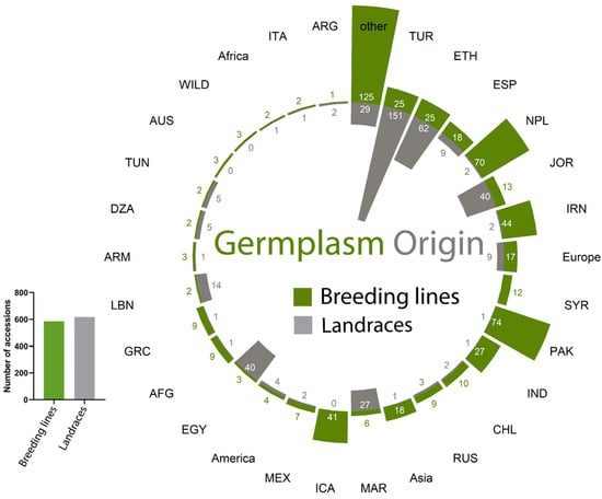 A Global Lentil Diversity Panel of 1315 genotypes including improved lines, accessions, landraces and released varieties was subjected to large field screening and evaluation for resistance to O. crenata (Figure 5). The germplasm collection was provided by the International Center of Agricultural Research in dry areas genebank—ICARDA, Rabat. The trial was conducted during the cropping seasons in 2018/2019 in a highly O. crenata-infested plot at ICARDA Marchouch research station, Morocco. Different genotypes were planted at the end of November according to an augmented design with repetitive checks. For each genotype, 30 seeds were planted in 1 m rows with 30 cm inter-row spacing. The local cultivar Bakria (ILL 4605), which is reported to be moderately resistant to O. crenata [31], was used as a repeated check. No herbicides or fertilizers were applied throughout the crop cycle. Hand weeding was undertaken where necessary.