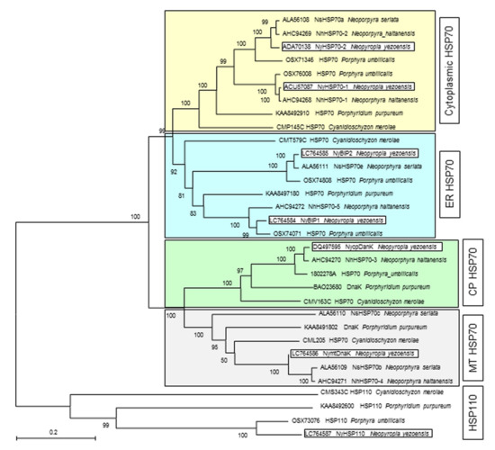 Recently, a genome-wide survey of the HSP70 genes in N. yezoensis led to the identification of 15 genes [46], although these included HSP110 genes, the number may not be accurate. In their study, four classes of HSP70s were proposed, as in our present study; however, their phylogenetic tree was different from the one presented in Figure 1. Our tree clearly demonstrated the separation of cytoplasm- and ER-localized HSP70s from organellar HSP70s, revealing differences in the origins of the organellar HSP70s and the other HSP70s [14,15]. By contrast, the phylogenetic tree produced by Yu et al. [46] included ER-localized HSP70s in the clade containing organellar HSP70s, and one of the CP-localized HSP70s was located in the cytoplasmic HSP70s clade. It is not clear why such a difference occurred; thus, we must identify other HSP70 genes in N. yezoensis and revise the phylogenetic trees to validate their true relationships and origins. Moreover, Yu et al. [46] reported the presence of two nuclear genes encoding chloroplast-localized HSP70 in N. yezoensis. They used established analysis tools to predict the subcellular localization of HSP70s; however, it remains necessary to identify the conserved amino acid sequence motifs and putative chloroplast signal peptides to resolve the uncertain classification and characterization of the N. yezoensis HSP70s.