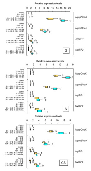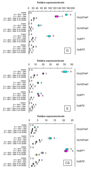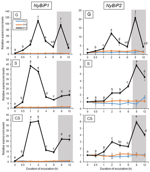 Effects of temperature changes on the expression of NyBiP1 and NyBiP2 in three life stages of Neopyropia yezoensis. Values on the y-axis represent the fold-change of the expression of each gene relative to that at 0 h. Shading indicates dark period. Significant differences in the expression level in the three life stages, indicated by different letters, were defined from triplicate independent replicate data using a one-way ANOVA with a Tukey’s test (p < 0.05). G, gametophyte; S, sporophyte; CS, conchosporophyte.