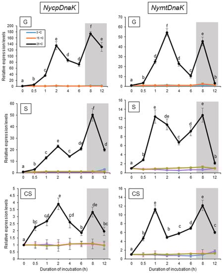Effects of temperature changes on the expression of NycpDnaK and NymtDnaK in three life stages of Neopyropia yezoensis. Values on the y-axis represent the fold-change of the expression of each gene relative to that at 0 h. Shading indicates dark period. Significant differences in the expression level in the three life stages, indicated by different letters, were defined from triplicate independent replicate data using a one-way ANOVA with a Tukey’s test (p < 0.05). G, gametophyte; S, sporophyte; CS, conchosporophyte.