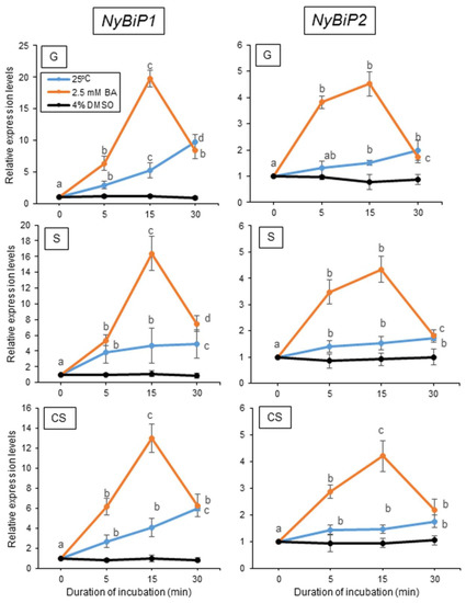 Relationship between the changes in the physical state of the membrane and the expression of NyBiP1 and NyBiP2 in three life stages of Neopyropia yezoensis. Membrane fluidization or rigidification was induced by pharmacological treatment with 2.5 mM benzyl alcohol (BA) or 4% dimethyl sulfoxide (DMSO), respectively, at 15 °C for 5, 15, and 30 min, after which the expression of the genes of interest was compared to their expression at 25 °C. Values on the y-axis represent the fold-change in the expression of each gene relative to that at 0 h. Significant differences in the expression level in the three life stages, indicated by different letters, were defined from triplicate independent replicate data using a one-way ANOVA with a Tukey’s test (p < 0.05). G, gametophyte; S, sporophyte; CS, conchosporophyte.