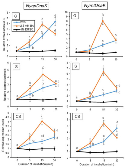 Relationship between the changes in the physical state of the membrane and the expression of NycoDnaK and NymtDnaK in three life stages of Neopyropia yezoensis. Membrane fluidization or rigidification was induced by pharmacological treatment with 2.5 mM benzyl alcohol (BA) or 4% dimethyl sulfoxide (DMSO), respectively, at 15 °C for 5, 15, and 30 min, after which the expression of these genes was compared to their expression at 25 °C. Values on the y-axis represent the fold-change in the expression of each gene relative to that at 0 h. Significant differences in the expression level in the three life stages, indicated by different letters, were defined from triplicate independent replicate data using a one-way ANOVA with a Tukey’s test (p < 0.05). G, gametophyte; S, sporophyte; CS, conchosporophyte.