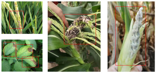 Due to the diversity of the collection devices, the data were uniformly processed to before being used in the model, as discussed in Section 5.2. The crops collected included maize, wheat, rice, and cotton. A total of 16 healthy and diseased crops were collected, and the specific dataset distribution is shown in Table 5.