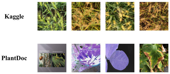 To further verify the generalization of this study, open-source datasets on Kaggle [45] and Plantdoc [46] were used, which contained the image datasets as shown in Figure 2.