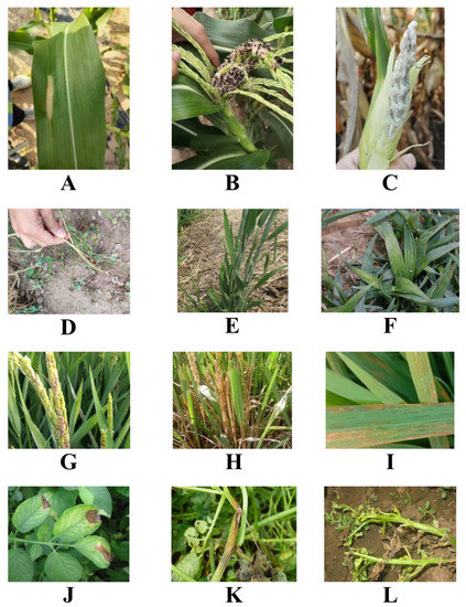 Samples from our dataset. (A) macrophthalmia (maize); (B) black Sigatoka (maize); (C) tumor black powder (maize); (D) black Sigatoka (wheat); (E) green dwarf (wheat); (F) yellow leaf (wheat); (G) rice fever (rice); (H) stripe blight (rice); (I) bacterial streak (rice); (J) late blight (potato); (K) black shin (potato); (L) blight (potato).