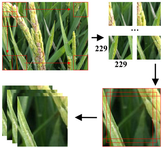 As illustrated in Figure 7, the original image was scanned with a sliding window of size , resulting in multiple images. Following that, the images were cropped using the method employed in the AlexNet [54] model to generate five images, as shown in Figure 7.