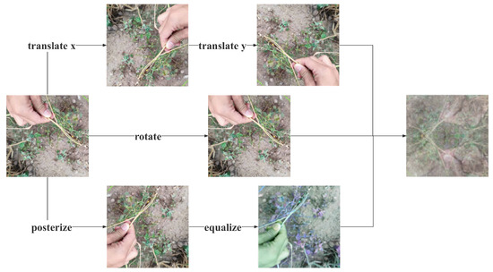 From Table 5, it is evident that the number of disease datasets varied significantly among crops. Due to the crop maturation cycle, maize images were scarce compared to other crops, and such classes with low data percentages are collectively referred to as weak classes in the following sections. Since machine learning training is highly data-dependent, its core principle is to adjust model parameters through the combination of inputs and outputs, and classes with low data shares may be discriminated against by the model. For instance, if the percentage of weak classes is very low, e.g., only 1%, the model can simply assign input images directly to the strong classes, which can still guarantee an accuracy of 99%. To address this issue, some data enhancement methods were employed to preprocess the model, which are described in detail in Section 5.2.