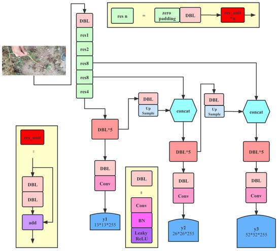 Illustration of proposed method based on detection network. When constructing convolutional neural networks (CNNs), some fundamental building blocks are commonly employed to enhance network performance and training stability. Here are two typical building blocks: (1) DBL (Conv + BN + Leaky ReLU): DBL is a basic module that combines a convolutional layer (Conv), batch normalization (BN), and Leaky ReLU activation function. In DBL, the convolutional layer (Conv) is responsible for extracting local features from the input feature map. Batch normalization (BN) is a regularization technique that accelerates network training and mitigates the issues of vanishing and exploding gradients. Leaky ReLU is a nonlinear activation function with a small negative slope, providing. a certain gradient in the negative region, thereby alleviating the vanishing gradient problem. The DBL module integrates these techniques, rendering network training more stable and enhancing feature extraction capabilities. (2) Res_unit (basic residual block): The residual unit (res_unit) is a fundamental module that utilizes skip connections to effectively address the vanishing and exploding gradient problems in deep networks. A basic residual block consists of two DBL layers, where one DBL layer follows another. There is a skip connection between these two DBL layers, connecting the input directly to the output of the second DBL layer. This skip connection allows gradients to propagate more easily within the network, making deep networks easier to train.