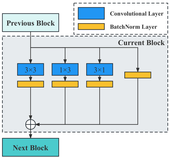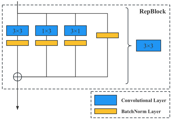 During the training phase, denotes replacing a convolution with the sum of three parallel branches . As illustrated in Figure 13, a convolution can be obtained by convolving ; finally, the results of these three convolutional layers are fused to obtain the convolutional layer output. It is important to note that the , , and convolutions of the trained model are fused first, and then the new model is derived and ultimately used.