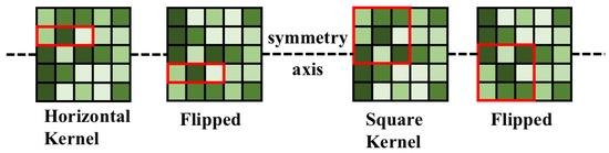 In Figure 14, the two red rectangles are the image features extracted before and after the image flip operation and are still the same at the same position of the input image. For the square-shaped convolution, the extracted features are different.
