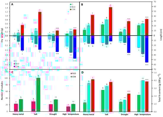Growth parameters and nodulation. (A) Dry weight of shoot (top graphs) and roots (bottom graphs), (B) length of shoot and roots, (C) number of nodules, and (D) nitrogen content in non-inoculated and inoculated M. sativa plants after 60 days in pots under greenhouse conditions using different substrates. Values are means ± S.D. (n = 16). Different letters and symbols indicate means that are significantly different from each other (One-way ANOVA, LSD test, p < 0.0001). C-: non inoculation; N10: inoculation with Ensifer sp. N10; CSN: inoculation with the SynCom formed by Pseudomonas sp. N4, Pseudomonas sp. N8, Ensifer sp. N10, and Ensifer sp. N12; heavy metal treatment: soil from the middle marshes of the Odiel river as substrate; salt treatment: sterilized soil from the upper marshes of the Odiel river supplemented with 60 mM of NaCl as substrate; drought treatment: sterilized soil from the upper marshes of the Odiel river as substrate and plants exposed to drought stress; high temperature treatment: sterilized soil from the upper marshes of the Odiel river as substrate and plants exposed to 40 °C.
