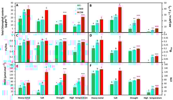 Photosynthetic parameters after the exposition of different stressful conditions. (A) Total chlorophyll content, (B) net photosynthetic rate (AN), (C) maximum quantum efficiency of PSII photochemistry (Fv/Fm), (D) quantum efficiency of PSII (ΦPSII), (E) intrinsic water use efficiency (iWUE), and (F) electron transport efficiency (ETR) in non-inoculated and inoculated M. sativa plants after 60 days in pots under greenhouse conditions in the case of heavy metal and salt treatments, and during the stress in the case of drought and high temperature treatments. Values are means ± S.D. (n = 16). Different letters and symbols indicate means that are significantly different from each other. (One-way ANOVA, LSD test, p < 0.0001). C-: non inoculation; N10: inoculation with Ensifer sp. N10; CSN: inoculation with the SynCom formed by Pseudomonas sp. N4, Pseudomonas sp. N8, Ensifer sp. N10, and Ensifer sp. N12; heavy metal treatment: soil from the middle marshes of the Odiel river as substrate; salt treatment: sterilized soil from the upper marshes of the Odiel river supplemented with 60 mM of NaCl as substrate; drought treatment: sterilized soil from the upper marshes of the Odiel river as substrate and plants exposed to drought stress; high temperature substrates: sterilized soil from the upper marshes of the Odiel river as substrate and plants exposed to 40 °C.