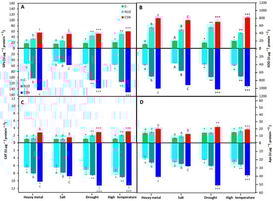 Antioxidant enzymes activities after the exposition of different stressful conditions. (A) Guaiacol peroxidase (GPx), (B) superoxide dismutase (SOD), (C) catalase (CAT), and (D) ascorbate peroxidase (GPx) in shoots (top graphs) and roots (bottom graphs) of non-inoculated and inoculated M. sativa plants after 60 days in pots under greenhouse conditions in the case of heavy metal and salt treatments, and during the stress in the case of drought and high temperature treatments. Values are means ± S.D. (n = 16). Different letters and symbols indicate means that are significantly different from each other. (One-way ANOVA, LSD test, p < 0.0001). C-: non inoculation; N10: inoculation with Ensifer sp. N10; CSN: inoculation with the SynCom formed by Pseudomonas sp. N4, Pseudomonas sp. N8, Ensifer sp. N10, and Ensifer sp. N12; heavy metal treatment: soil from the middle marshes of the Odiel river as substrate; salt treatment: sterilized soil from the upper marshes of the Odiel river supplemented with 60 mM of NaCl as substrate; drought treatment: sterilized soil from the upper marshes of the Odiel river as substrate and plants exposed to drought stress; high temperature substrate: sterilized soil from the upper marshes of the Odiel river as substrate and plants exposed to 40 °C.