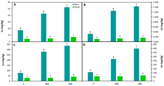 Metal/loids concentration after the exposition of heavy metal stress. (A) arsenic (As), (B) cadmium (Cd), (C) copper (Cu), and (D) zinc (Zn) concentrations in shoots and roots of M. sativa plants inoculated with different inoculums after 60 days in pots under greenhouse conditions using soil from the middle marshes of the Odiel river as substrate. Values are means ± S.D. (n = 16). Different letters indicate means that are significantly different from each other (One-way ANOVA, LSD test, p < 0.0001). C-: non inoculation; N10: inoculation with Ensifer sp. N10; CSN: inoculation with the SynCom formed by Pseudomonas sp. N4, Pseudomonas sp. N8, Ensifer sp. N10, and Ensifer sp. N12.