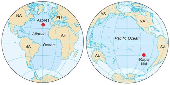 Locations of Rapa Nui and the Azores Islands (red dots) in the Pacific and Atlantic oceans, respectively. AF, Africa; AS, Asia; AU, Australia; EU, Europe; NA, North America; SA, South America.