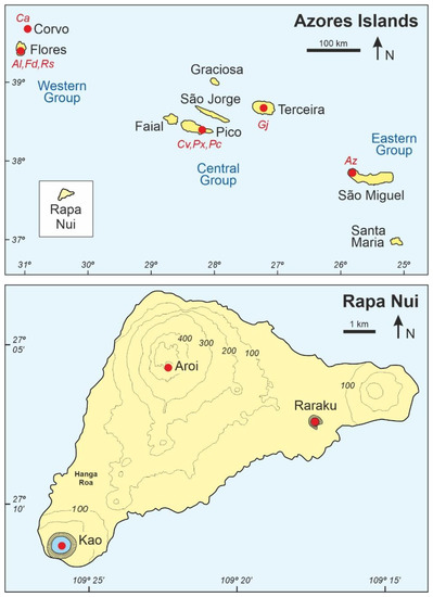 Sketch-map of the Azores archipelago (above) and Rapa Nui (below) at different scales to facilitate representation of the localities mentioned in the text. Rapa Nui (164 km2), of intermediate size between Flores (141 km2) and Faial (173 km2), is also represented in the upper panel (white box) at the same scale of the Azores islands for comparison. Red dots are the coring areas, some of which contain more than one coring site (Al, Alagoinha mire; Az, Lake Azul; Ca, Lake Caldeirão; Cv, Lake Caveiro; Fd, Lake Funda; Gj, Lake Ginjal; Pc, Pico bog; Px, Lake Peixinho; Rs, Lake Rasa). Details are available in Ref. [20] for Rapa Nui and Refs. [14,21,22,23] for the Azores.