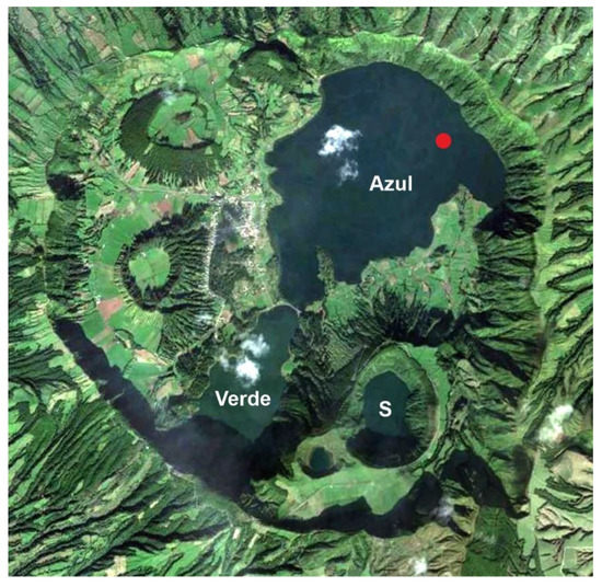Google Earth image of the crater Sete Cidades, on Azorean São Miguel Island, and its three lakes (S, Santiago). The red dot in Lake Azul is the coring locality. The darker green patches are planted Cryptomeria (Cupressaceae) forests, introduced from Japan. Modified from Ref. [14].