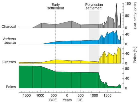 The recent finding of paleoecological evidence compatible with human presence in sediments older than 800 CE has suggested that the first settlement could have occurred earlier. Especially significant is the finding of pollen from Verbena litoralis (Verbenaceae), a plant of tropical American origin that is presently widespread all over the island, in Lake Raraku sediments. This anthropochorous (dispersed by humans) plant, locally known as “puringa” and characteristic of agricultural and ruderal disturbed sites, was previously considered to have been introduced on the island in post-Columbian times (1492 CE), but is actually present in the Raraku sediments, in a continuous and abundant fashion, from 450 BCE to the present [51]. The appearance of V. litoralis pollen coincided with the first fires and a forest decline coeval with a grassland expansion (Figure 5), which was interpreted in terms of anthropogenic disturbance, probably by small human groups of unknown origin, as formerly suggested by Mann et al. [47]. Also significant is the presence of pollen from the Iridaceae Sisyringium (probably S. michrantum) between 410 CE and 630 CE in the sediments of the Aroi bog. This plant is also of American origin and is now naturalized elsewhere. Other potential indications of human disturbance are the forest declines documented by 50–100 CE in Lake Kao [52] and by 1730-910 CE in Lake Raraku [53]. However, the lack of specific anthropogenic markers prevents sound assessment.