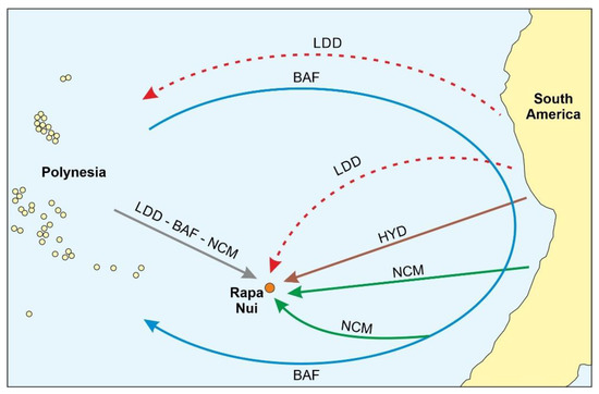 - Thorsby, E. Genetic evidence of a contribution of Native Americans to the early settlement of Rapa Nui (Easter Island). Front. Ecol. Evol. 2016, 4, 118. [Google Scholar] [CrossRef]