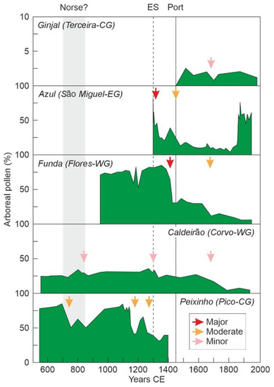Arboreal pollen fluctuations in the five sequences analyzed by Raposeiro et al. [23], sorted chronologically. The arrows mark the main forest declines, according to the legend within the box. The gray band is the time interval proposed by the authors for the purported Norse settlement. Redrawn and simplified from the original. ES, early settlement; Port, Portuguese settlement.