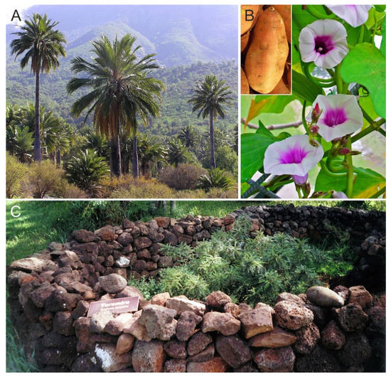 (A) The Chilean wine palm Jubaea chilensis growing in La Campana National Park, on the Pacific Chilean coasts (photo courtesy by A. Mieth). (B) Flowers and fruits of sweet potato (Ipomoea batatas) (https://commons.wikimedia.org/wiki/File:Ipomoea_batatas_002.jpg, accessed on 22 May 2023). (C) A modern reproduction of a “manavai” in the Botanical Garden of Hanga Roa, the capital of Rapa Nui (https://commons.wikimedia.org/wiki/File:ToromiroRapanui.jpg, accessed on 22 May 2023).