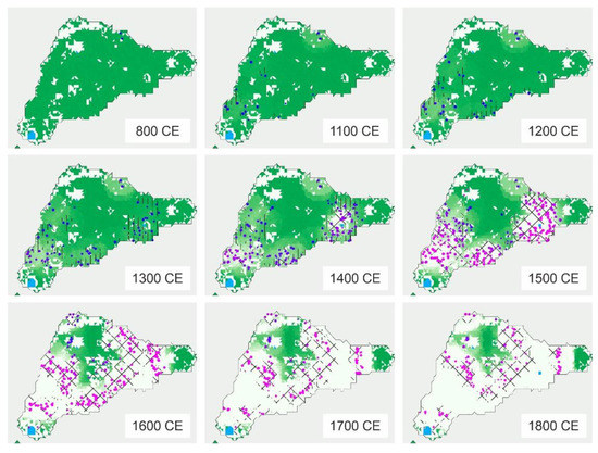 Forest (green areas) retreat and garden (blue and pink dots) proliferation in Rapa Nui during the last millennium, simulated with an agent-based model of human-resource interactions. The green intensity represents the density of palms, ranging from 0 (white) to 7 (dark green) thousand trees per cell. The color of dots is the resource preference, in percentage of trees vs. gardens, ranging from 20% (pink) to 80% (blue). Modified from Ref. [86].