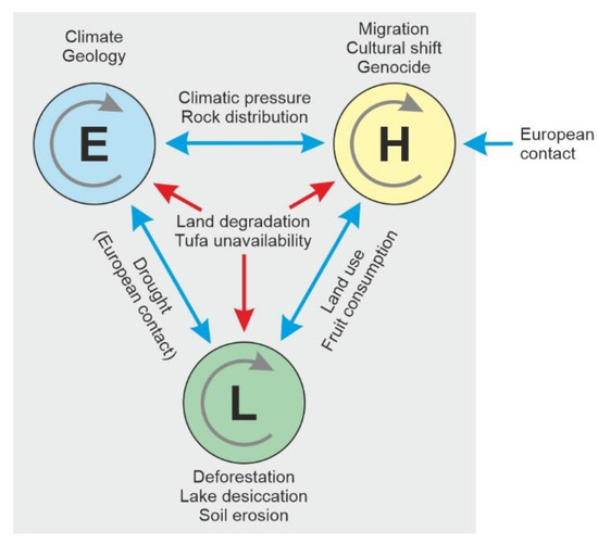 This type of feedbacks and synergies between climate and humans had not been previously considered in the Rapa Nui literature and opened a new opportunity for a holistic approach in the analysis of socioecological systems, known as EHLFS (environment-human-landscape feedbacks and synergies) [103]. The EHLFS approach was used to define six states in the development of the Rapa Nui socioecosystem during the last millennium, under a human ecodynamic perspective [104]. These stages were characterized by spatiotemporal changes in the interactions between environmental (E), human (H) and landscape (L) subsystems (Figure 13 and Figure 14).