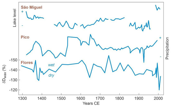 Hydroclimatic fluctuations as reconstructed in three lake sediment records from São Miguel [106], Pico [105] and Flores [107] islands using different proxies. Redrawn and composed from the original sources.