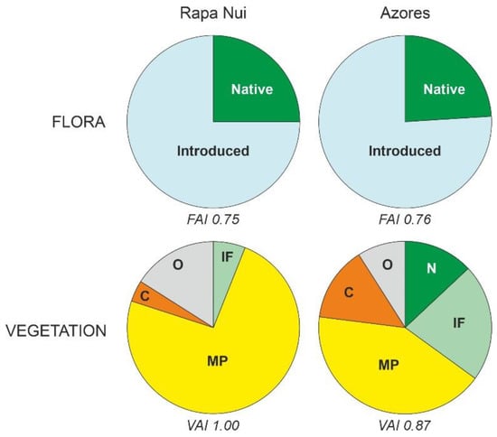 Comparison between the flora and vegetation of Rapa Nui and the Azores in terms of anthropization (data from Table 2). Vegetation types: C, crops; IF, introduced forests; MP, meadows/pastures; N, native; O, others. Anthropization indices: FAI, Floristic Anthropization Index; VAI, Vegetation Anthropization Index.