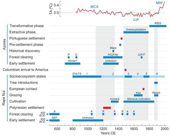 Chronological synthesis of the events and processes described in former sections for Rapa Nui and the Azores, considering the last 1.5 millennia. The gray bands highlight the phases of coincidence between Rapa Nui and the Azores trends explained in the text. Climatic phases according to Ref. [110]; TA, temperature anomaly with respect to preindustrial values. Climatic phases: L, Little Ice Age; MCA, Medieval Climate Anomaly; MW, Modern Warming. Rapa Nui localities: A, Aroi; K, Kao; R, Raraku. Azores islands: C, Corvo; F, Flores; M, São Miguel; P, Pico; T, Terceira. NA, Native Americans; R/EG, reforestation with alien trees and extensive grazing.