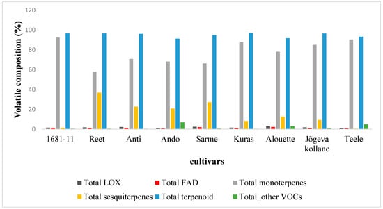 A separate clustering based on each individual VOC group (Figure S1): FAD, including LOXs (Figure S1a), monoterpenes (Figure S1b), and sesquiterpenes (Figure S1c), did not delineate the cultivars according to the resistance categories. In the biplot (Figure S1a), the LOXs tend to be more closely correlated, likewise for the FAD compounds. However, the biplot based on the terpenoids (monoterpenes, sesquiterpenes, and isoprene combined) shows some extent of clustering of the cultivars according to their resistance categories (Figure S1d). The low-resistance cultivars Reet, Teele, Jõgeva Kollane, and 1681-11 were all clustered on the negative axis of PC2, where Reet, Teele, and Jõgeva Kollane were in a separate quadrant. On the other hand, the highly resistant cultivars Ando, Sarme, Anti, and Kuras were grouped on the positive PC2 axis. The biplot based on the terpenoids accounted for 54.6% of the variation. As shown in the heatmap (Figure 3), there was a significant correlation between cultivar resistance and total VOC emissions.