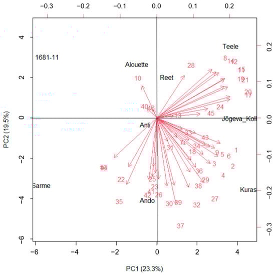 Biplot of the first two principal components of the emitted VOCs showing the distribution of different potato cultivars. Refer to Table 2 for the numbers assigned to each VOC.