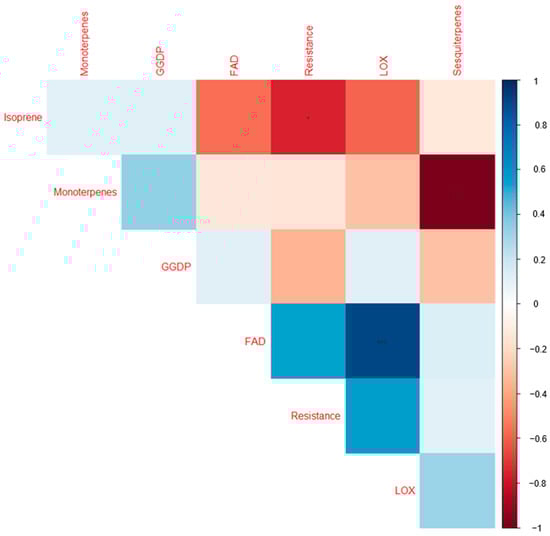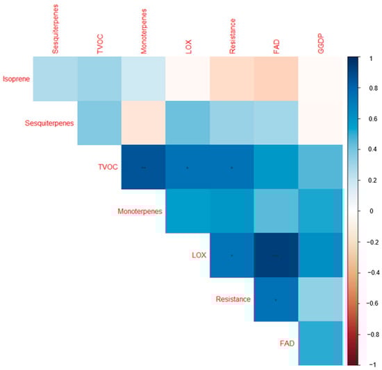 Correlogram visualizing the correlations between the share of secondary metabolites (% relative to the total VOCs) and cultivar resistance. The colors are proportional to the correlation coefficients. The positive and negative correlations are indicated by blue and red, respectively. A greater correlation coefficient is reflected by a color of higher intensity. * = significant at 0.05; *** = significant at 0.001. FAD: long-chained saturated-fatty-acid-derived compounds; LOX: classic green leaf volatiles; geranylgeranyl diphosphate (GGDP): 6-methyl-5-hepten-2-one.