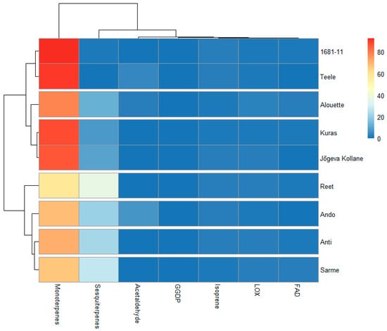 Two major clusters that did not correspond to the highly resistant and low-resistance cultivars can be noticed. However, sub-clusters containing highly resistant cultivars such as Ando, Anti, and Sarme that were grouped together, as well as the low-resistance cultivars 1681-11 and Teele that also form a sub-cluster, can be noticed, while the cultivar Reet tend to form a singleton. On the other hand, Jõgeva kollane tended to share some unique profiles with the highly resistant cultivars Alouette and Kuras. Except for isoprene, there were no significant correlations between the shares of the VOCs classes with resistance (Figure 5).