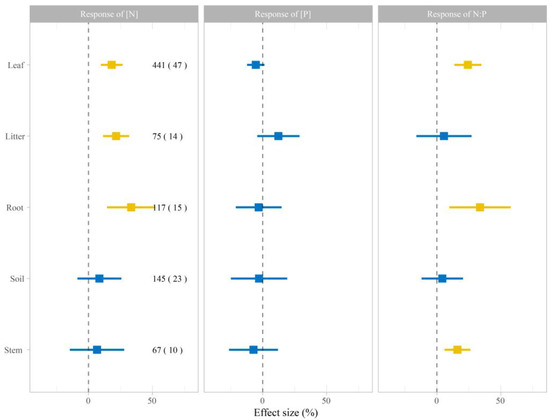 Effects of nitrogen (N) addition on the [N], [P], and N:P of leaves, litter, roots, soil, and stems. The values shown are mean ± 95% confidence intervals (CI). Values inside and outside the parentheses represent the number of observations and studies, respectively. Blue and yellow quadrates represent variables with 95% CI that do not overlap with zero (p < 0.05) and that overlap with zero (P > 0.05), respectively.