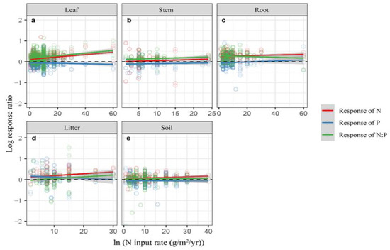 Furthermore, studies have indicated that the response of [N], [P], and N:P in plants and soil to N addition varies with the ecosystem compartments [21,26]. In a forest ecosystem, the increase in [N] and [P] and C:N:P stoichiometry in soil was more sensitive than that in leaves under N addition [32]. In a grassland, leaves N:P demonstrated a significant response to N addition via the effects on soil nutrients, soil stoichiometry, and plant community composition, while root N:P stoichiometry changed via the impact on soil nutrients and stoichiometric ratios [20]. Therefore, the effects of N addition on [N], [P], and N:P in the terrestrial ecosystems may vary with the ecosystem compartments. Considering the possible opposite results of N addition, a quantitative evaluation that unifies the results of each experiment can help to understand the [N], [P], N:P of plant and soil responses to N addition.