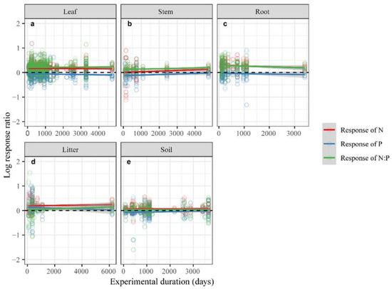 Relationship between experimental duration and natural logarithm response ratio (lnRR) of [N], [P], and N:P in leaves (a), stems (b), roots (c), litter (d), and soil (e) under N addition. Open circles represent the observations of a specific element. Colored lines are fitted by partial linear regressions, with shaded areas representing the 95% confidence intervals. p-values are shown in Table 1.