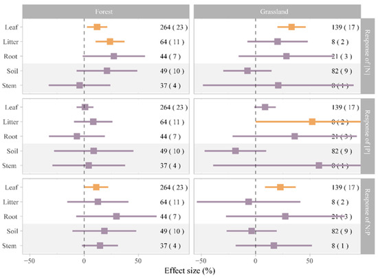 Effects of nitrogen (N) addition on [N], [P], and N:P of leaves, litter, roots, soil, and stems in a forest ecosystem and a grassland ecosystem. Orange and purple quadrates represent variables with 95% confidence intervals that do not overlap with zero (p < 0.05) and that overlap with zero (P > 0.05), respectively.