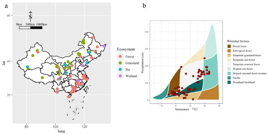 Geographical distribution (a) and Whittaker biomes (b) of the 75 study sites in China included in the meta-analysis.
