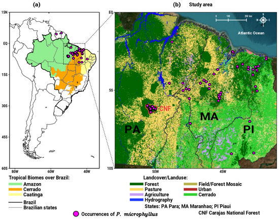 Maps with the occurrence points of P. microphyllus (circles) over: (a) South America, emphasizing the geographic domain of the three tropical biomes over Brazil; (b) study area of the present work in north/northeast Brazil with the landcover/landuse map in the year 2020.