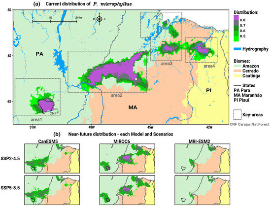 Potential distribution of suitable habitats for P. microphyllus (green to purple shaded areas) in the north/northeast Brazil between Amazon, Cerrado, and Caatinga biomes considering: (a) current and (b) near-future projections for each one of the three GCMs in SSP2-4.5 and SSP5-8.5 scenarios. Polygons in gray dashed lines in (a) indicate the key areas of occurrence of the species.
