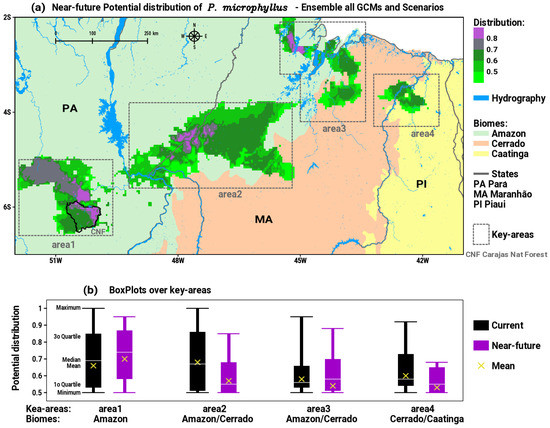 (a) Near-future (2020 to 2040) potential distribution of suitable habitats for P. microphyllus (green to purple shaded areas) considering the ensemble of all GCMs and scenarios; (b) boxplots of the distribution in the four key areas considering the statistics for current and near-future projections.